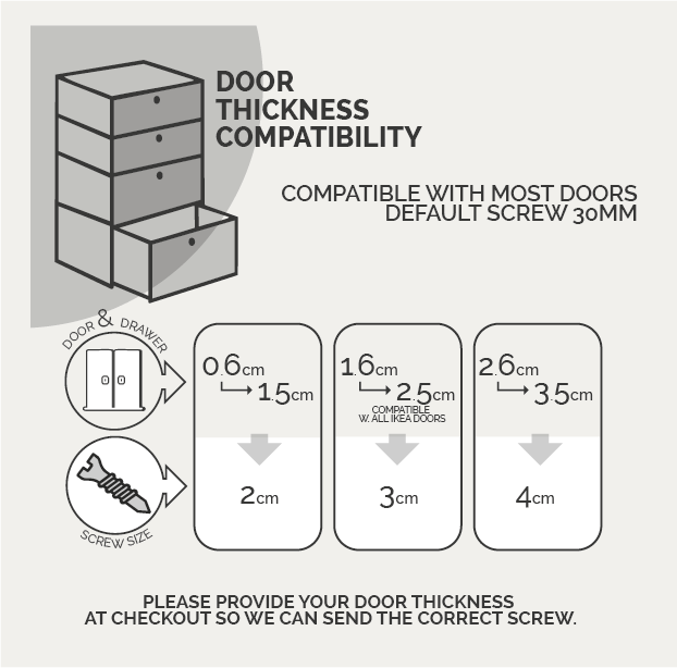 Each knob comes with a standard 30 mm screw, suitable for panel thicknesses between 16 mm and 25 mm (perfect for all IKEA furniture).