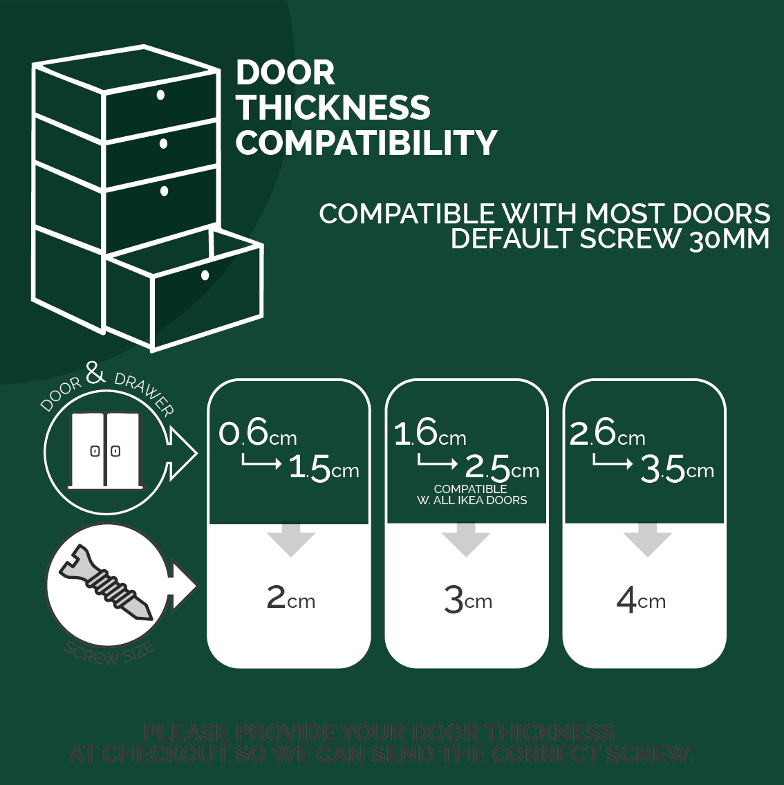 Each knob comes with a standard 30 mm screw, suitable for panel thicknesses between 16 mm and 25 mm (perfect for all IKEA furniture).
